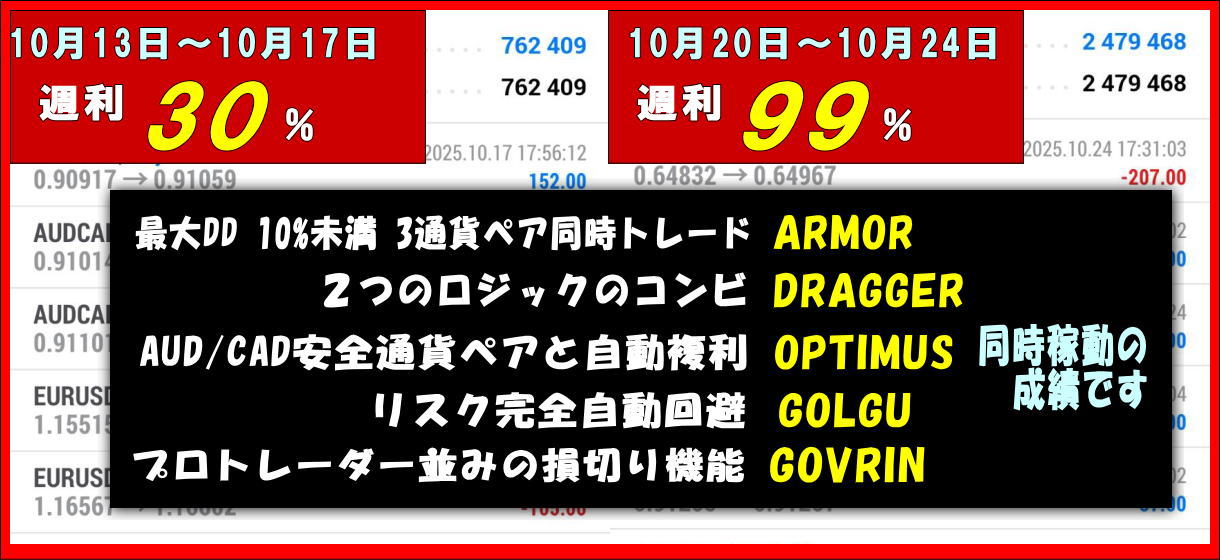 オプチャでは比較的安定しているARMOR、DRAGGER、OPTIMUS、GOLGU、GOVRINの同時稼働(頭文字をとってADOGG)を紹介しています。そのため、安定型を求める方、爆益EAとの分散運用を求める方に利用されています。