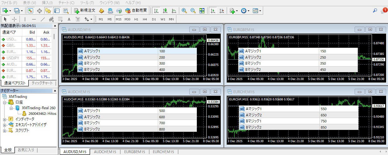 ZAKKER-FOURでしたら、AUDUSD,AUDCAD,EURGBP,EURCHFの4通貨ペアウィンドウを表示させて、それぞれにEA