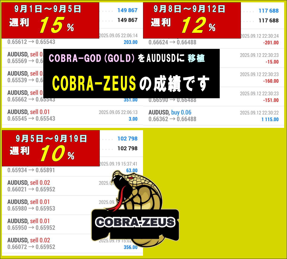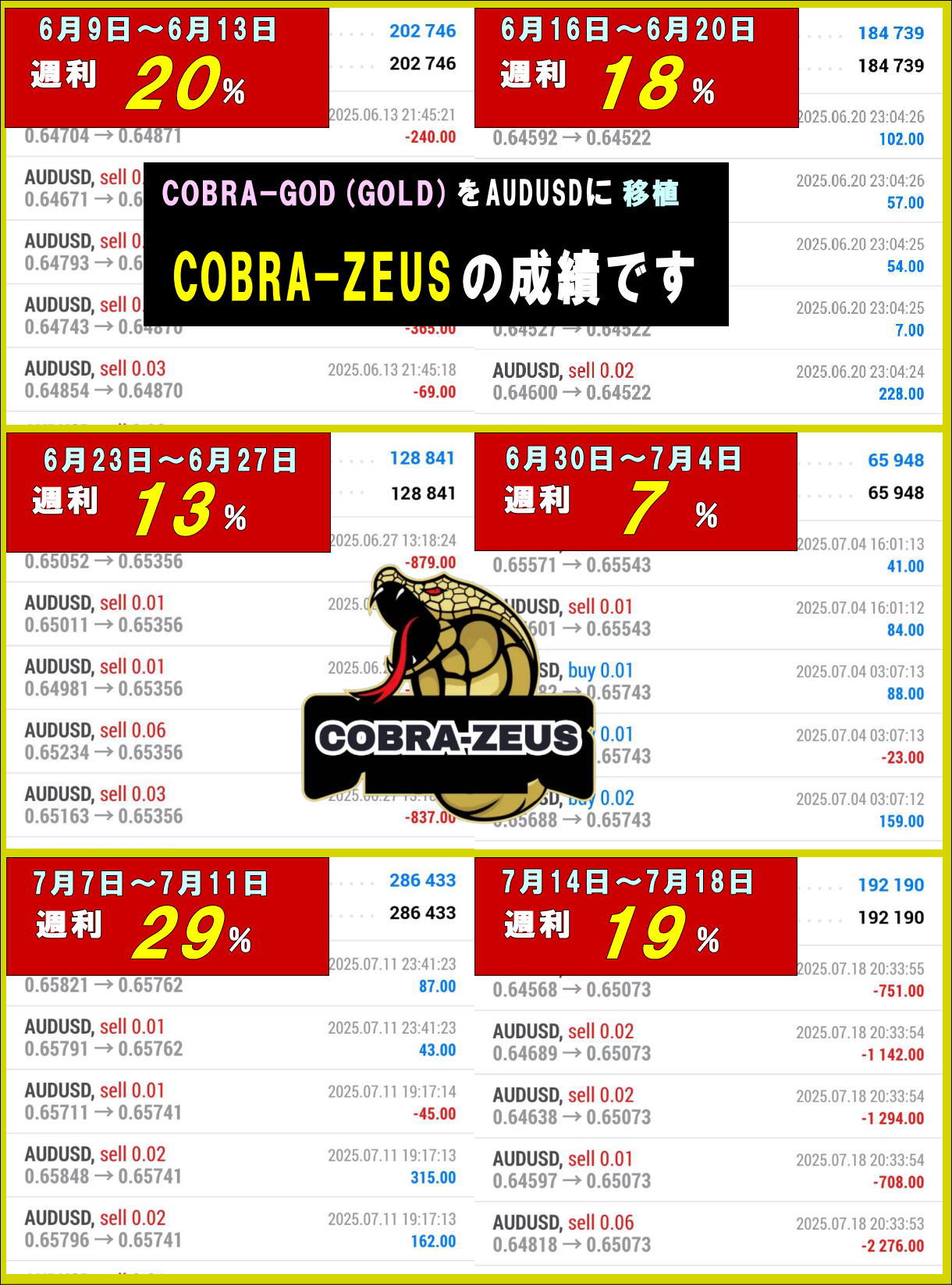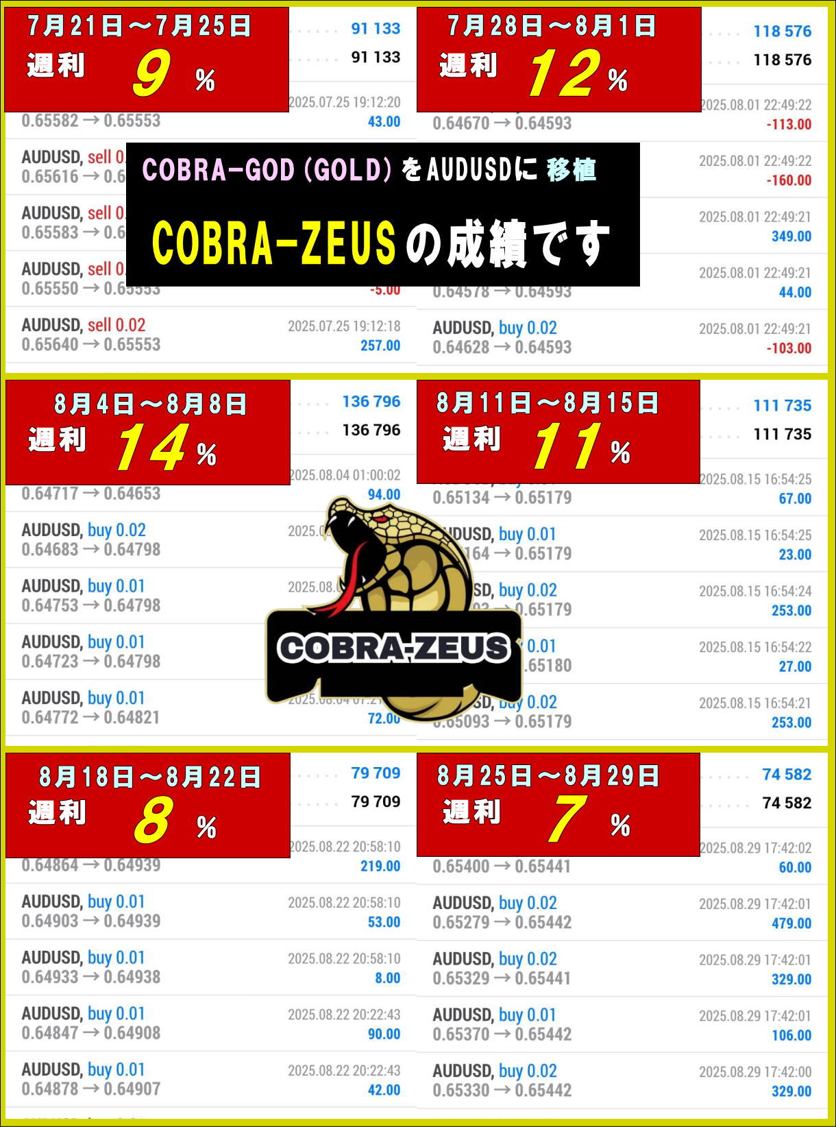 そのCOBRA-GODを、AUDUSDで稼働してみたら、低DD(平常時は15%程度)ながら月利100%も狙えるものとなっています。