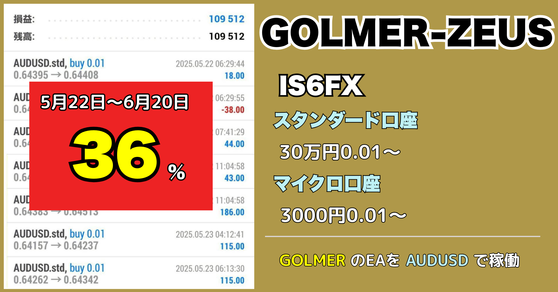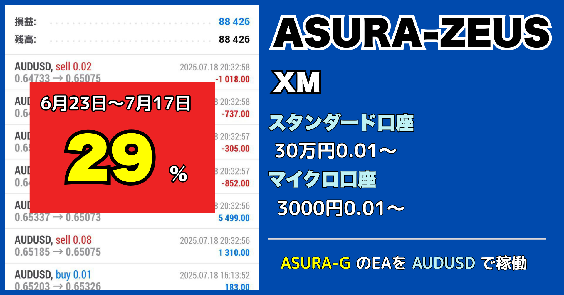 といった実績もある超爆益のゴールドEAですが、それを安定通貨ペアのAUDUSDに移植したものになります。